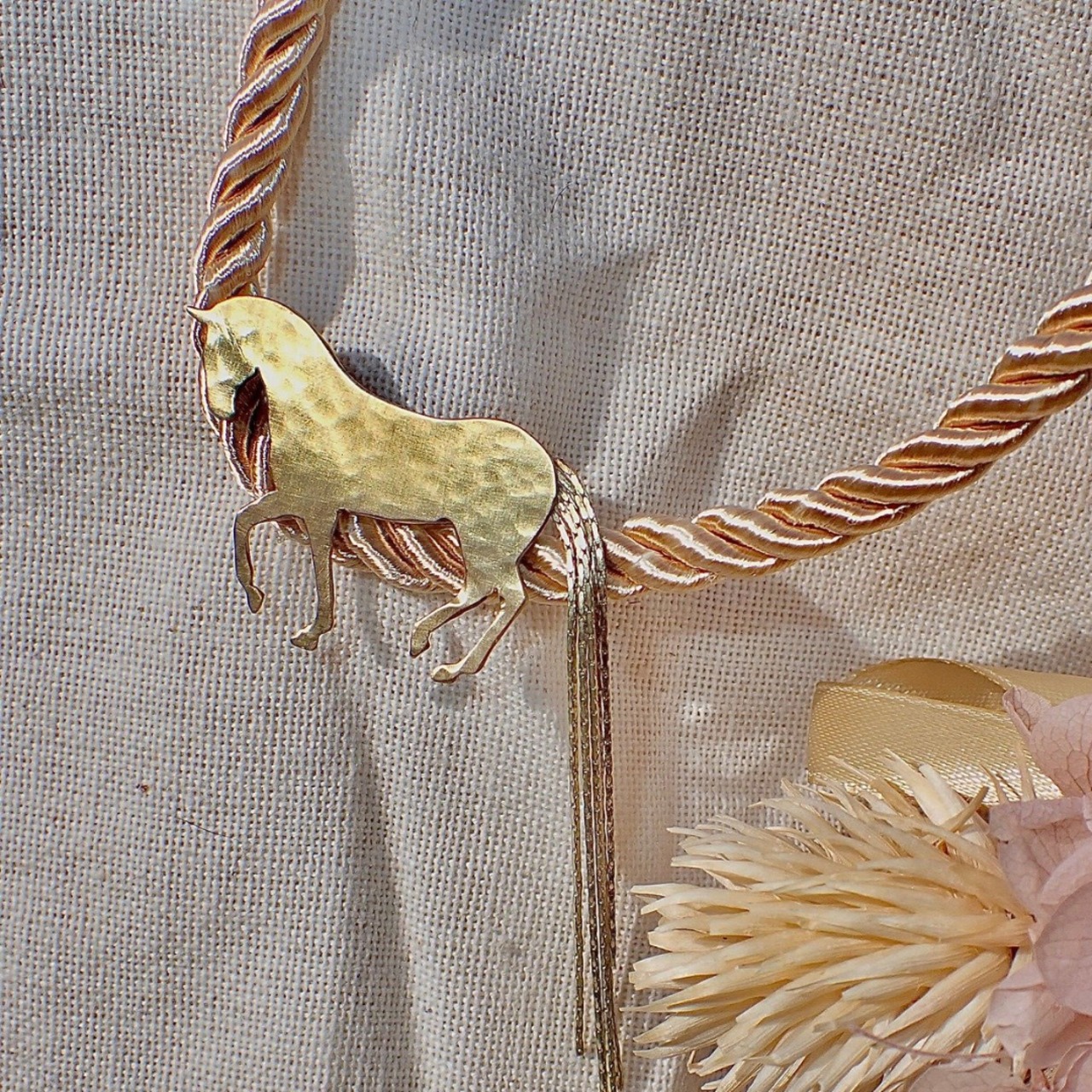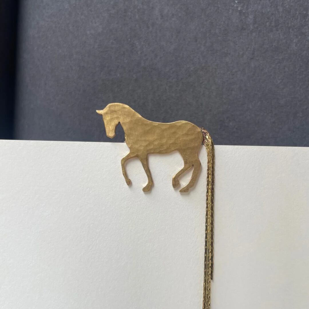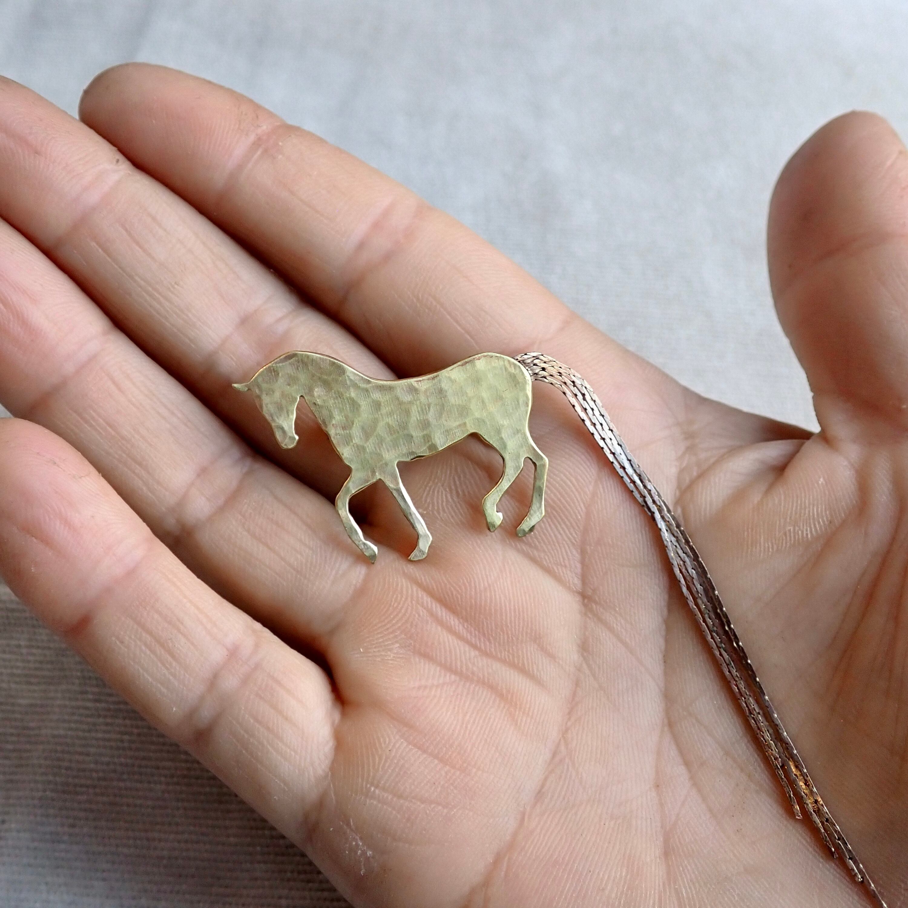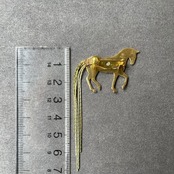 ピアッフェのステップを踏む美しい馬のシルエットをそのままに、ゆらゆらと揺れる長い尻尾を繊細なチェーンで表現した真鍮のブローチです。