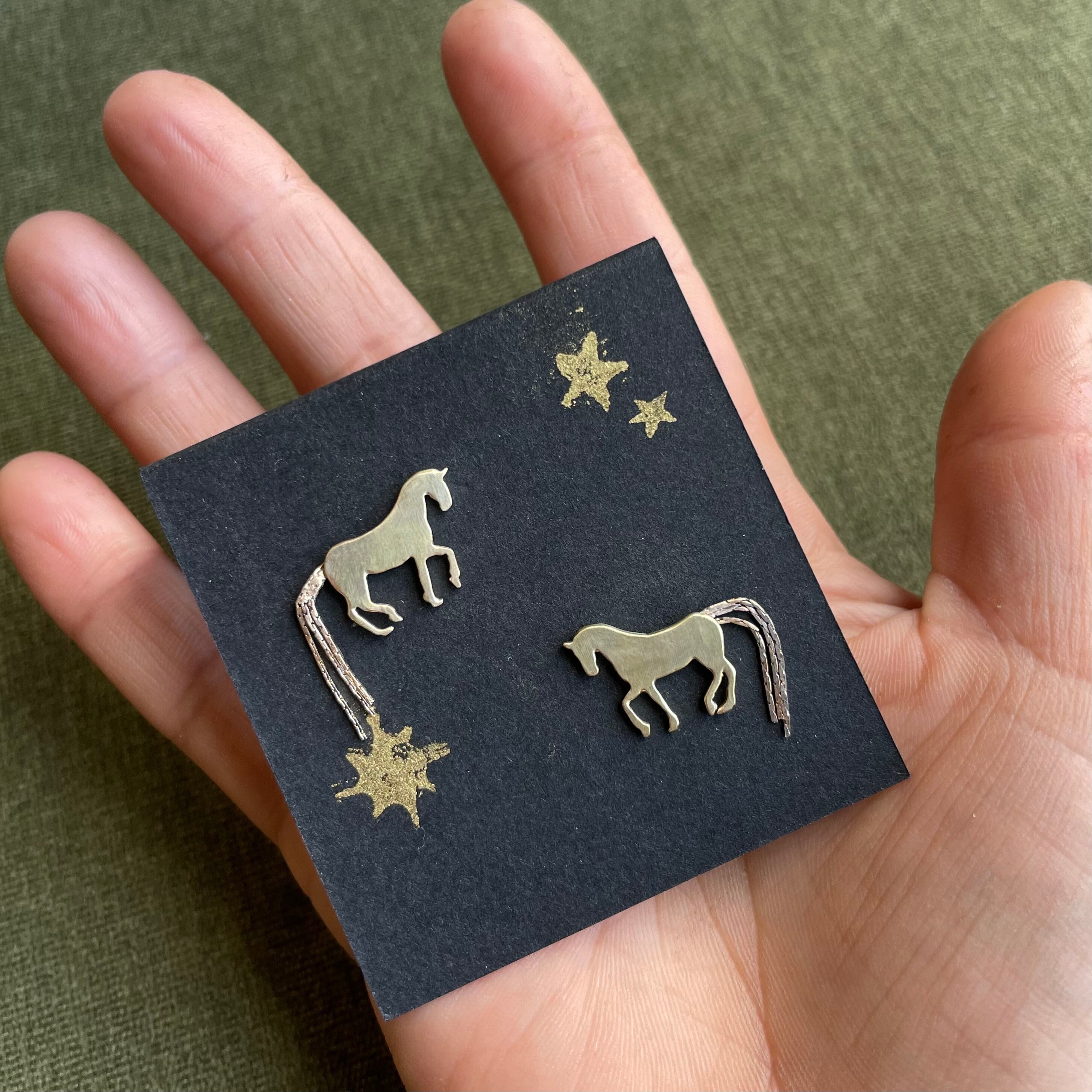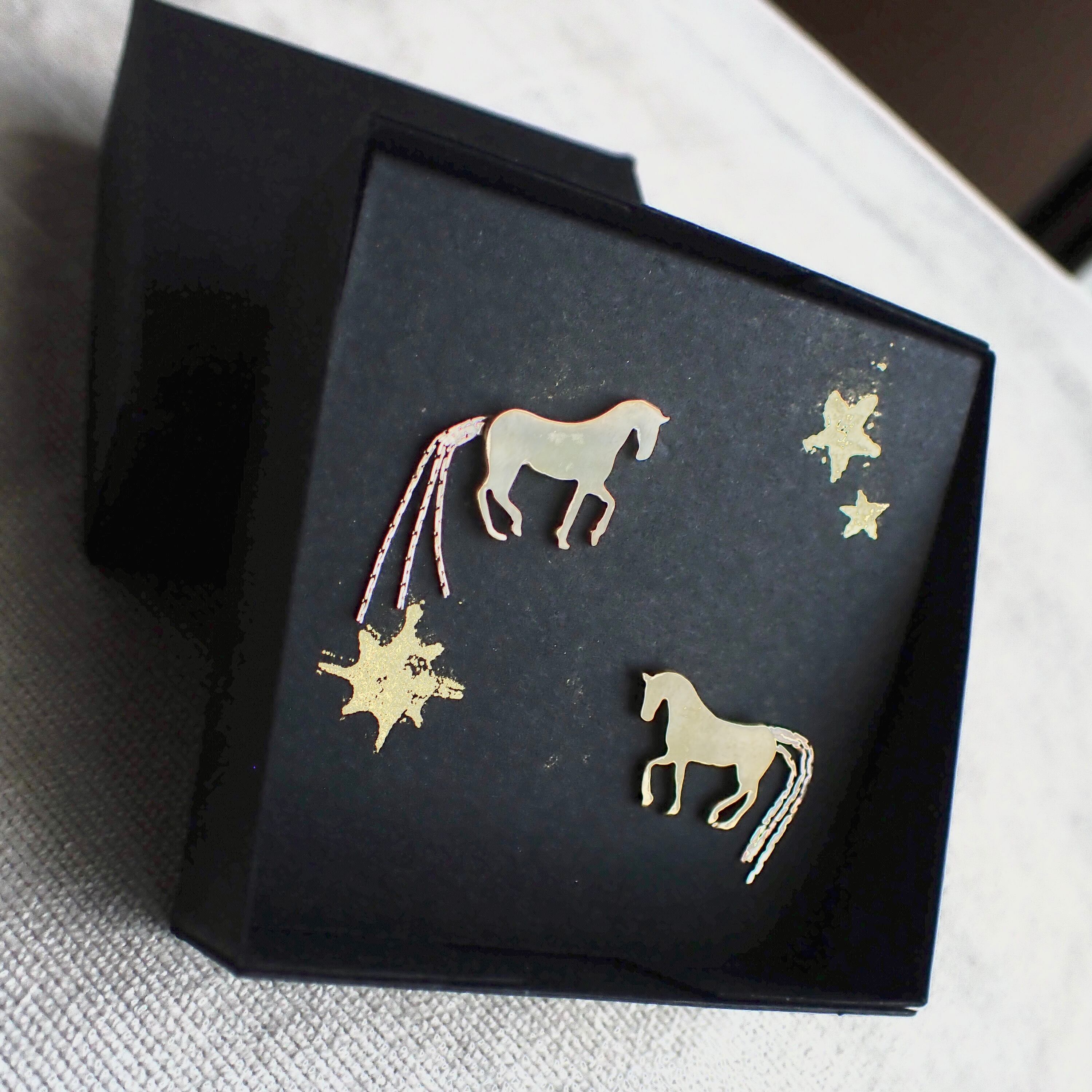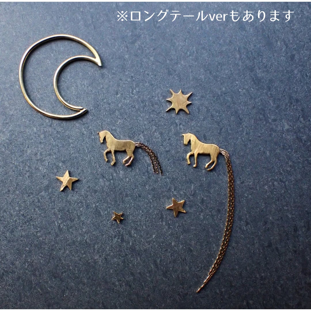 ピアッフェのステップを踏む美しい馬のシルエットをそのままに、ゆらゆらと揺れる尻尾を繊細なチェーンで表現した真鍮のピアスです。